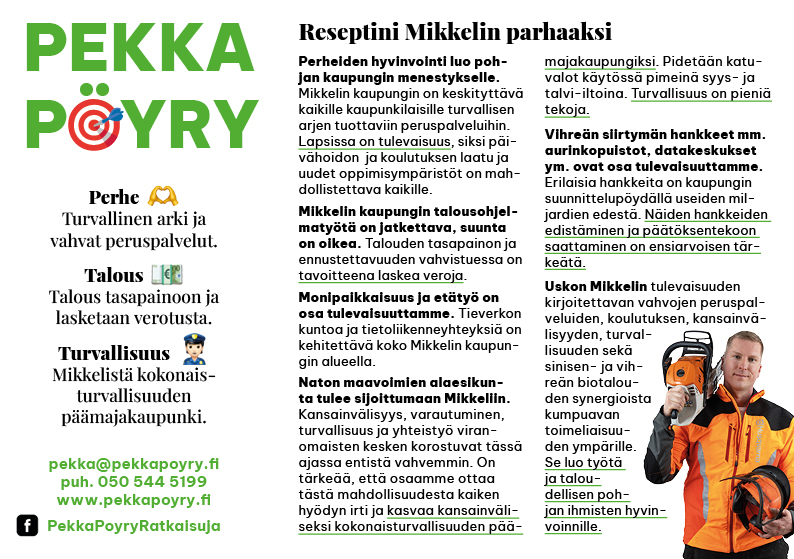 Pohtiessamme keskustalaisuutta tarkemmin, ovat kotiseuturakkaus ja toisista ihmisistä välittäminen meille keskustalaisille se voima ja vastuu, jonka tiedämme ohjaavan oikeaan suuntaan. Tulevissa aluevaaleissa onkin mielestäni kysymys välittämisestä, turvallisuudesta ja arjen toimivuudesta.