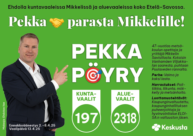 Olen Pekka Pöyry, 44 vuotias Mikkelin metsäkoulun opettaja ja yrittäjä Mikkelin Savisillasta. Perheeseeni kuuluvat vaimo ja kaksi lasta. Olen kotoisin Mikkelin Vanhamäen Viljakkalan saaresta, Puulaveden rannalta.